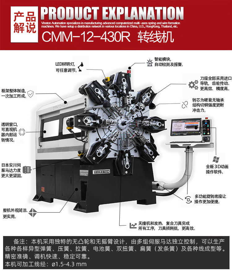 本機(jī)型適用于生產(chǎn)汽車、摩托車、自行車、線成型等車輛以及娛樂健身器材等產(chǎn)品所需的高精密彈簧產(chǎn)品