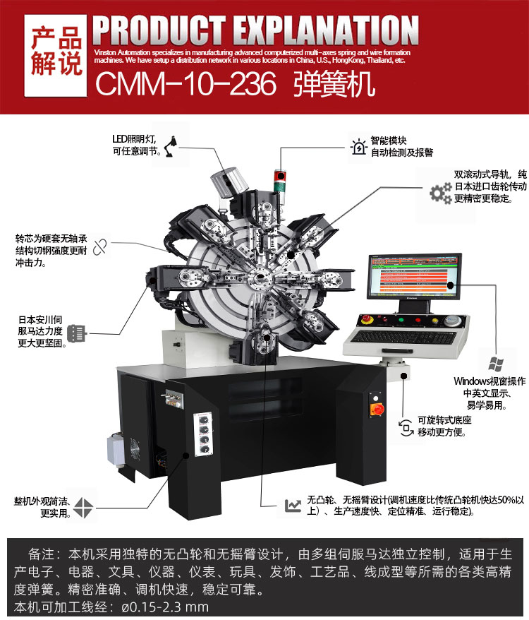 - 產(chǎn)品概述: CMM-10-236電腦彈簧機 可生產(chǎn)?0.15-2.3 mm線徑彈簧及線成形等)本機采用獨特的無凸輪和無搖臂設計,由多組伺服馬達獨立控制,可以生產(chǎn)各種各樣異型彈簧、壓簧、雙扭簧、電池簧、扁簧(發(fā)條簧)及各種線成型等。精密準確、調(diào)機快速、穩(wěn)定可靠。