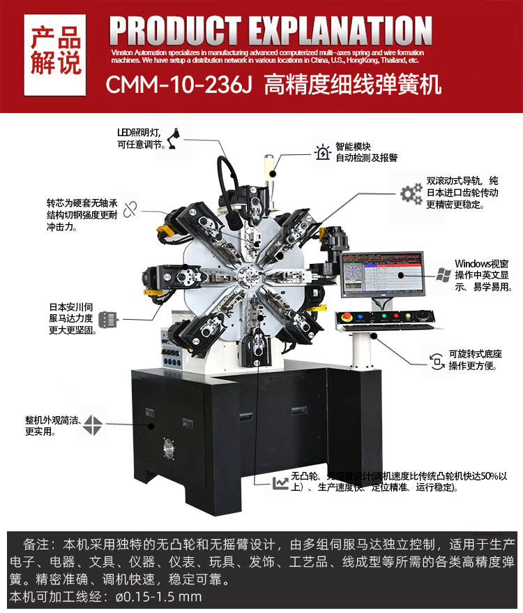 本機(jī)型適用于生產(chǎn)電子、電器、文具、儀器、玩具、發(fā)飾、工藝品、線成型等高難度精密彈簧。