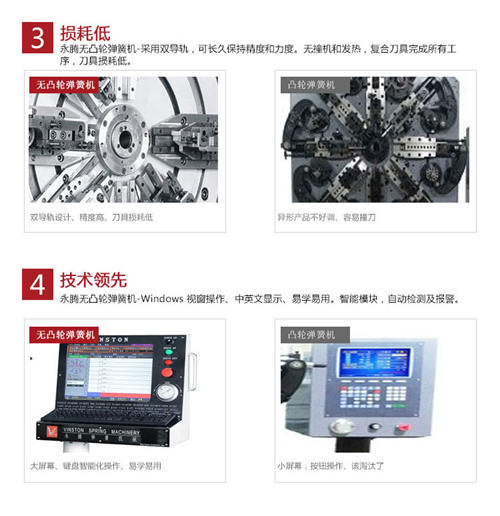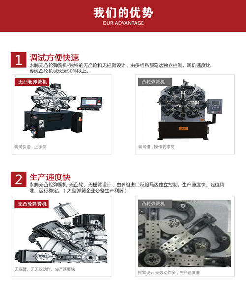 在近幾年無凸輪彈簧機逐漸得到彈簧生產(chǎn)廠家的認可。與傳統(tǒng)帶凸輪彈簧機相比,永騰無凸輪彈簧機在設(shè)計上采用獨特的無凸輪和無搖臂設(shè)計(調(diào)機速度比傳統(tǒng)凸輪機快達50%以上),其中無撞機和發(fā)熱、復合刀具完成所有工序,刀具損