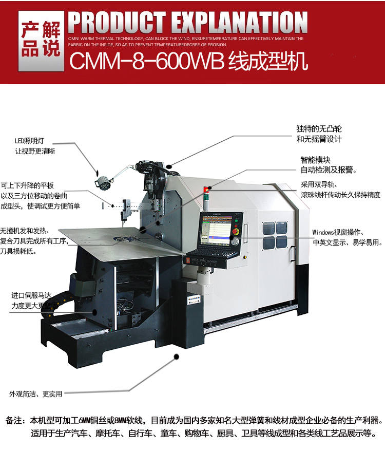 此次參展,東莞永騰自動化設(shè)備有限公司帶來的設(shè)備有CMM-8-600WB八軸多功能線材成型機、CMM-12-236R轉(zhuǎn)線機、CMM-12-450R轉(zhuǎn)線機,其中CMM-8-600WB八軸多功能線材成型機為此次展品的重頭戲。本機全部采用雙導(dǎo)軌滾珠絲桿傳動,以保證精度和力度。它可以加工4毫米鋼絲或6毫米軟線,目前成為國內(nèi)多家知名大型彈簧和線材成型企業(yè)必備的生產(chǎn)利器。無撞機發(fā)和發(fā)熱、復(fù)合刀具完成所有工序,刀具損耗低。智能模塊,還可以自動檢測及報警。Windows視窗操作、中英文顯示、易學(xué)易用。該設(shè)備適用生產(chǎn)汽車,摩托車,自行車,童車,購物車,廚具以及各類線成型工藝品展示架等。