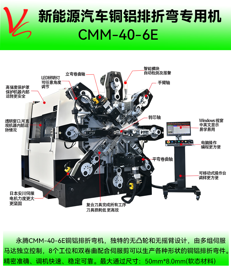 • 產(chǎn)品概述: CMM-40-6E銅排折彎機(最大通過尺寸:50mm*8.0mm)集3D折彎機和彈簧機所有的功能于一體的多功能專用機,本機采用獨特的無凸輪和無搖臂設(shè)計,由多組伺服馬達獨立控制,永騰銅排折彎機廣泛應(yīng)用于導電排成型,新能源電池連接排、新能源電池模組、銅母排成型、硬排成型、導電排、電池連接排、銅排、裸排成型等。精密準確、調(diào)機快速、穩(wěn)定可靠。